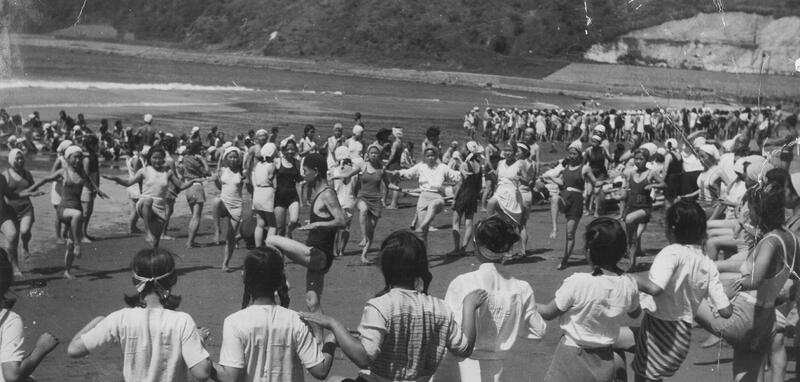 今から79年前、室蘭市陣屋町に広がる海岸で太平洋戦争終戦1年後に撮影された北海道庁立室蘭高等女学校時代の水泳会の様子です。(昭和21年8月27日火曜 南部陣屋水泳会)