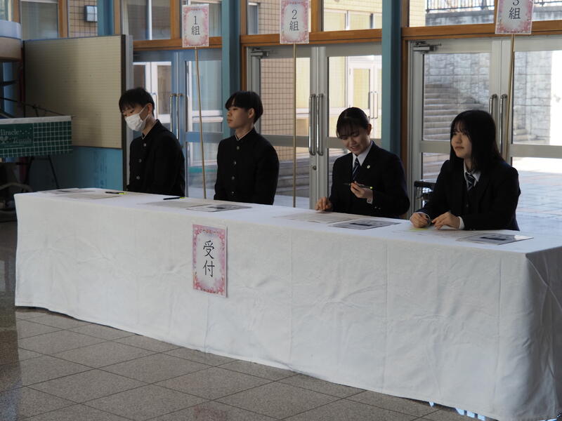青空に映えるオレンジ色とクリーム色の校舎が、3年次生の卒業をお祝いしてくれているようです。保護者受付は、今年もバスケットボール部の2年次生にお願いしました。