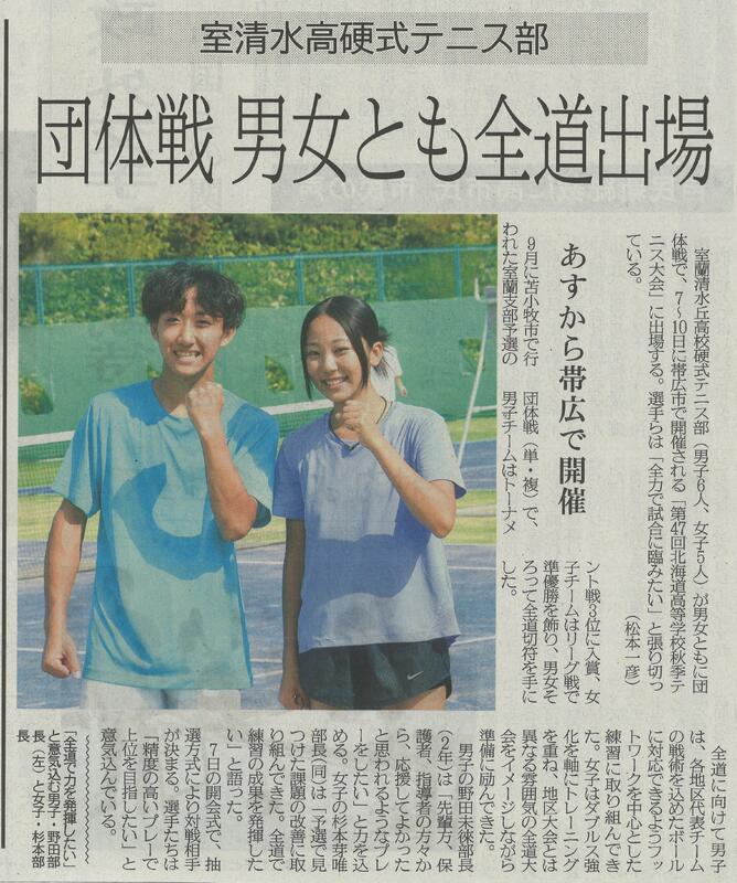 令和7年10月6日(月)の室蘭民報に、本校テニス部の記事が掲載されました。室蘭民報社提供(令和7年10月6日掲載)