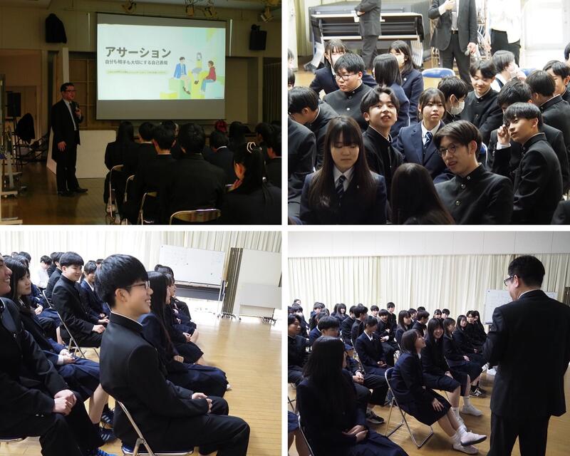 2年次、1年次の全学級において、アサーション講座を行いました。講師は今井校長です。アサーション(assertion)とは、自分も相手も尊重しながら、自分の意見や気持ちを誠実に、率直に伝える「自他尊重の自己表現」のことです。