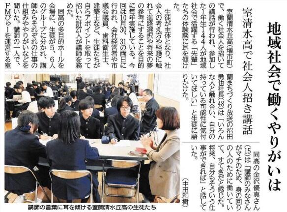 先月実施した社会人講話の記事が、北海道新聞に掲載されました。本校での取り組みをこのように取り上げていただき、ありがとうございます。