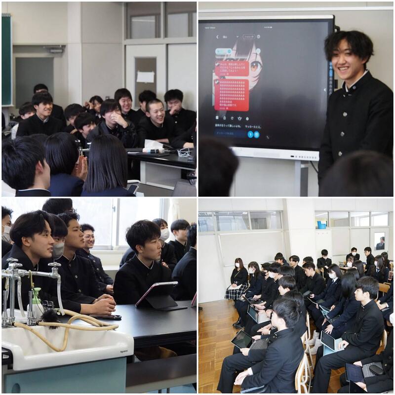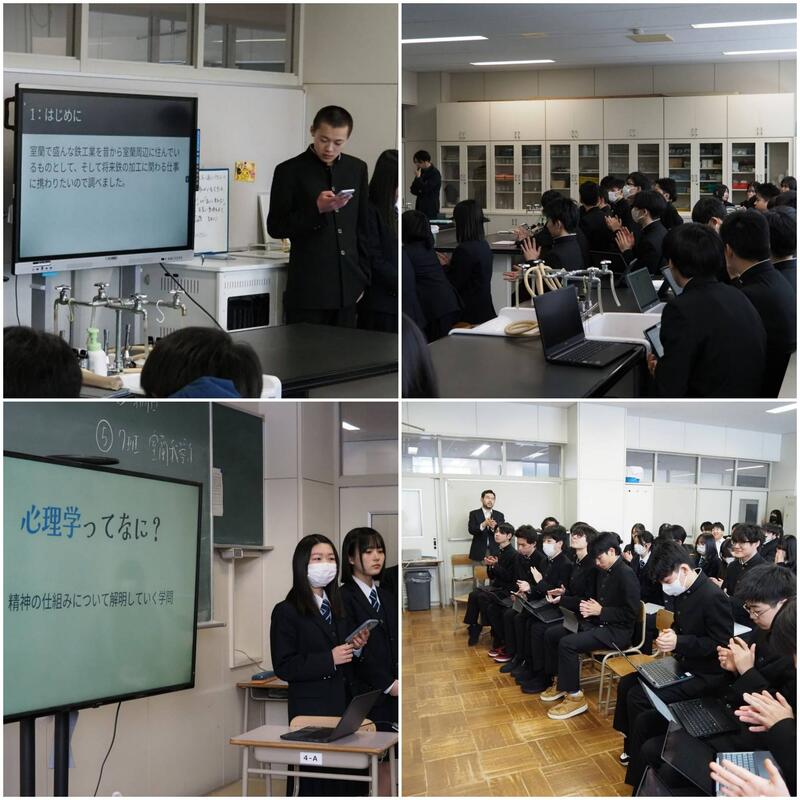 2年次の総合的な探究の時間では、各チームで掲げたテーマに基づき、半年かけて探究を進めました。『室蘭の鉄鋼業』『心理学』『管理栄養士』『AIクローン』など、それぞれ興味・関心のある分野に関して探究した成果を1年次生に向けて発表しました。