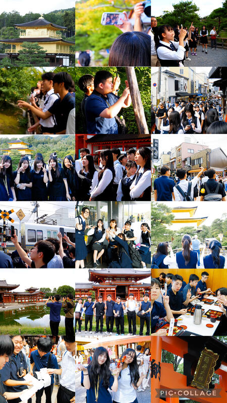 本校2年次は大阪から京都へバスで移動しました。車中ではガイドさんが、車窓に広がる景色や地域の歴史・文化をわかりやすく解説してくださり、移動そのものが学びの時間になりました。
